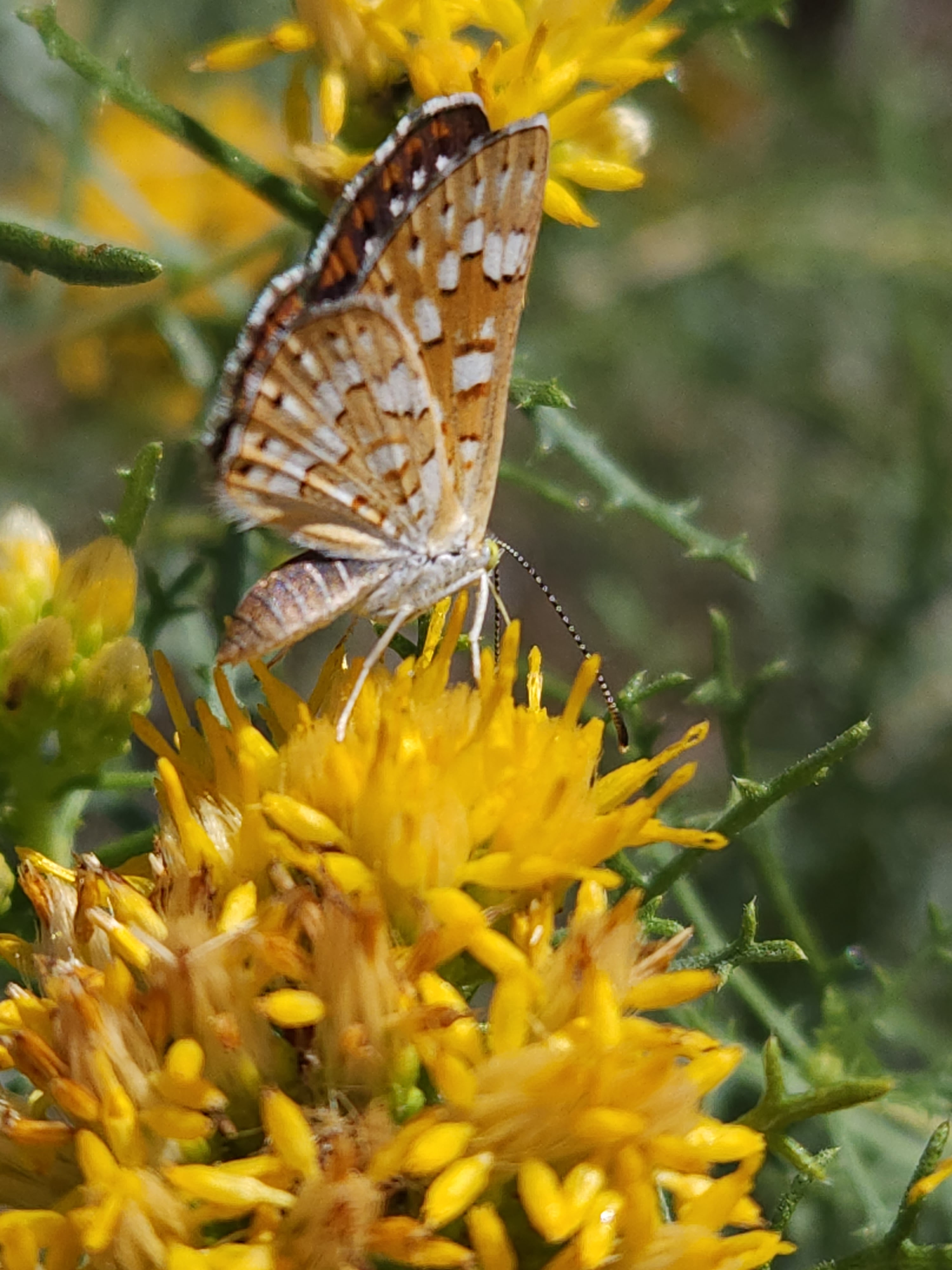 Saw these Palmer's Metalmark butterflies - (Apodemia palmerii) on the Isocoma rusbyi, Rusby's Goldenbush in the yard. Near bottom on Pineleaf Milkweed.